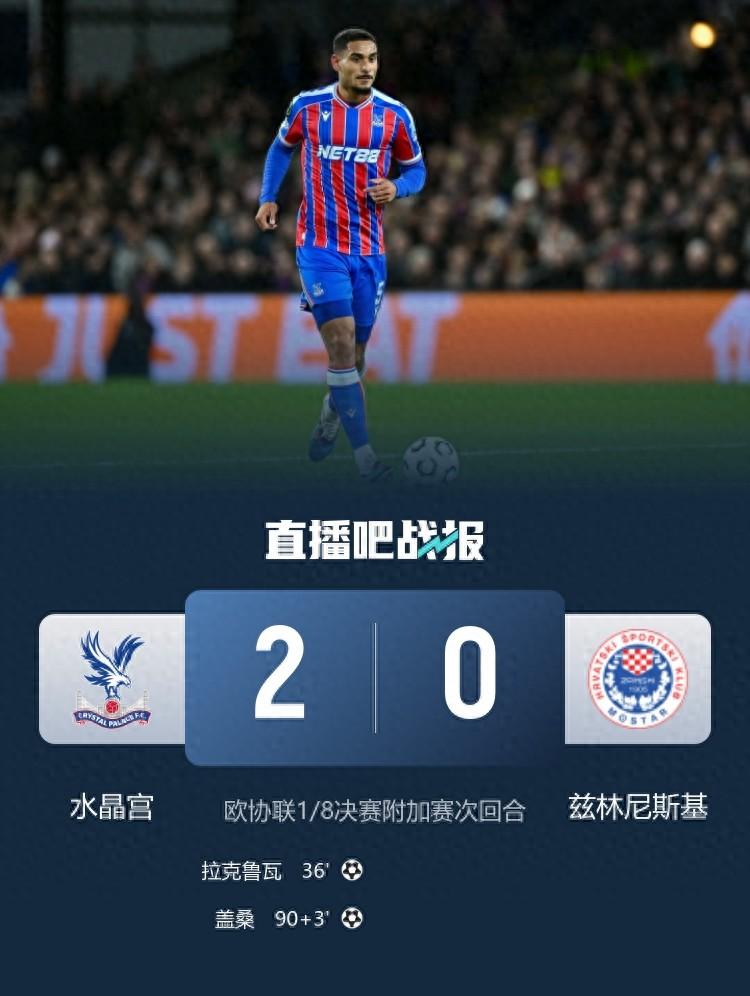 2月27日訊 北京時間2月27日04:00,歐協聯附加賽次回合水晶宮迎戰茲林尼斯基的比賽在塞爾赫斯特公園球場進行,首回合雙方1-1戰平,上半場蓋桑頭球造險,沃頓助攻拉克魯瓦頭球首開記錄,下半場蓋桑低射鎖定勝局,最終水晶宮2-0總比分3-1茲林尼斯基晉級16強。