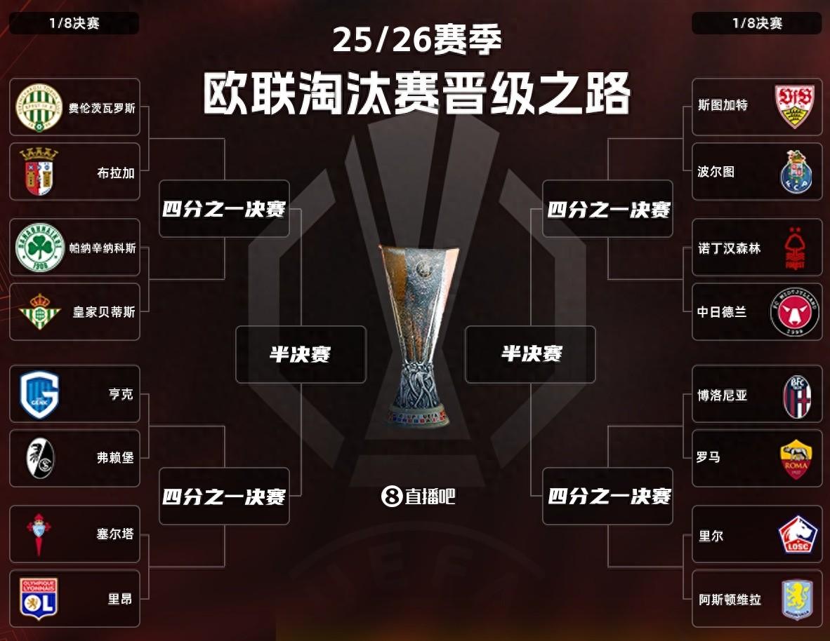 2月28日訊 歐聯杯1/8決賽對陣抽籤結果出爐,相關機構更新了各隊在該項賽事最新的奪冠賠率,阿斯頓維拉3.75第一。