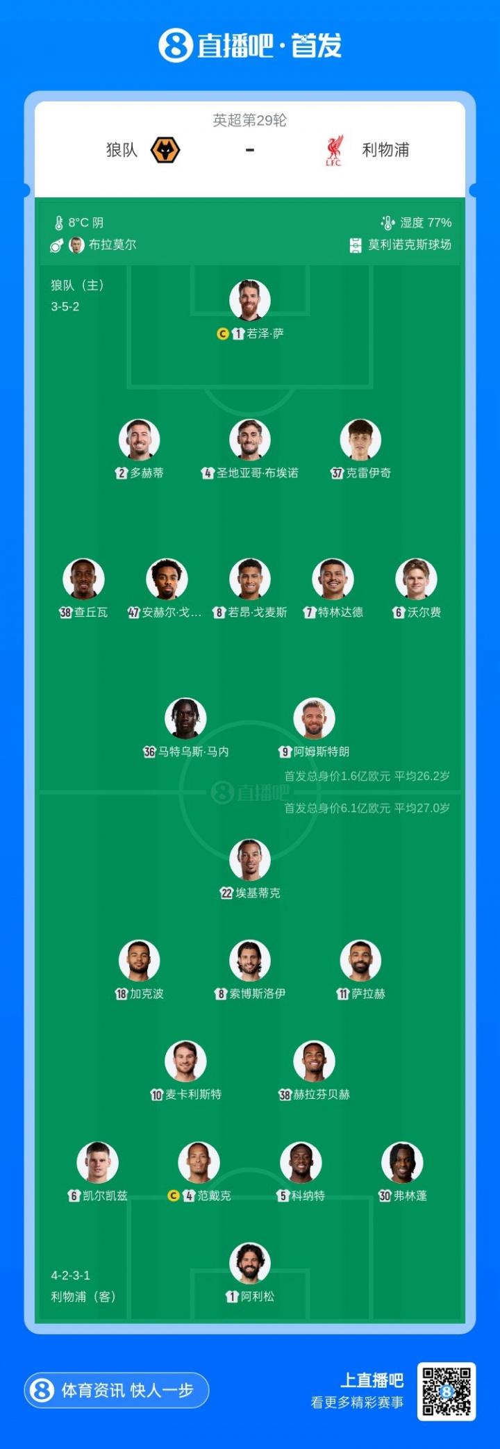 3月4日訊 英超第29輪,狼隊主場迎戰利物浦比賽即將打響。賽前首發出爐。