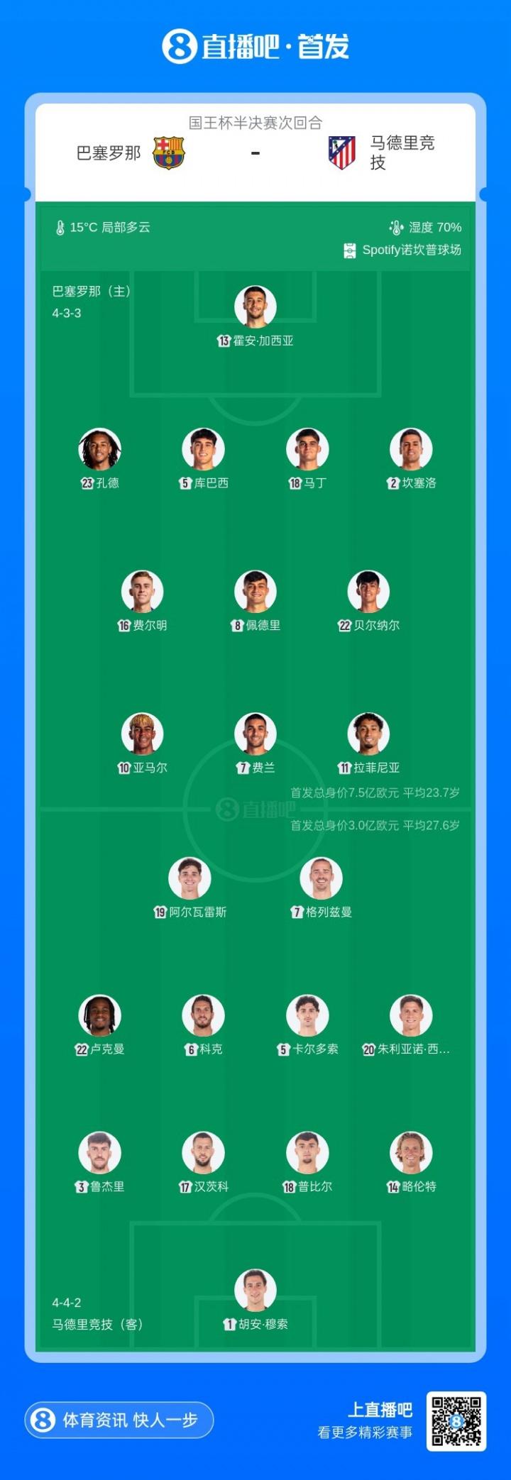 3月4日訊 國王杯半決賽次回合,巴薩對陣馬競,賽前首發公佈。巴薩方面亞馬爾、坎塞洛、貝爾納爾先發,馬競方面阿爾瓦雷斯、盧克曼、格列茲曼出戰。