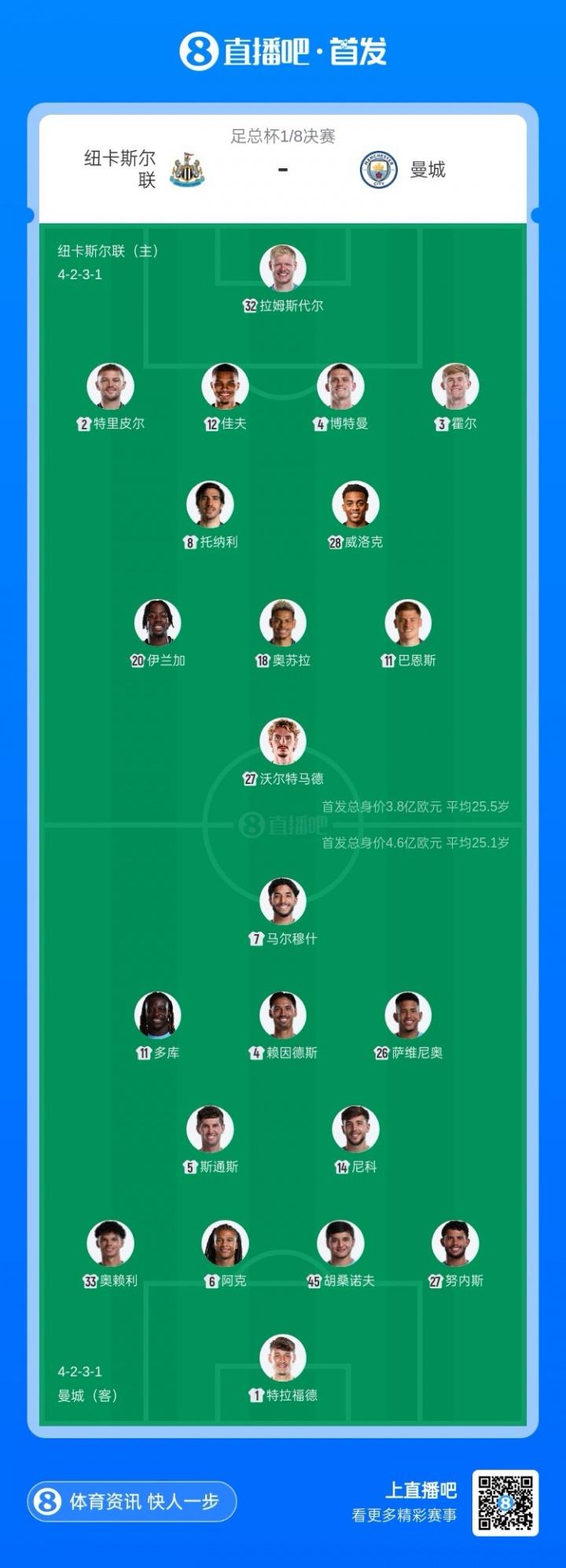 3月8日訊 足總盃16強對陣,紐卡對陣曼城比賽即將打響。賽前首發出爐。