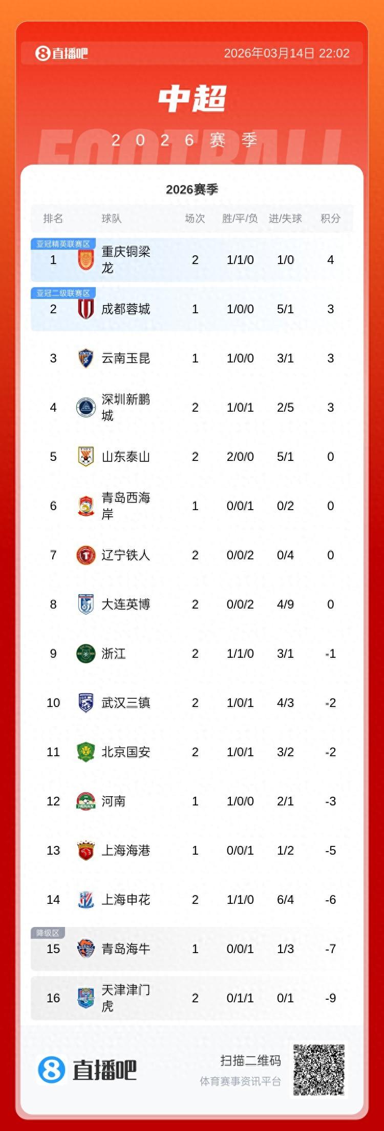 03月14日訊 中超第2輪今日比賽結束,泰山2-1國安,浙江1-1申花,銅梁龍1-0鐵人,新鵬城1-0津門虎。目前積分榜上,重慶銅梁龍4分暫列榜首,深圳新鵬城3分第4,山東泰山0分第5,遼寧鐵人、大連英博兩連敗分列七八,天津津門虎負9分仍墊底。