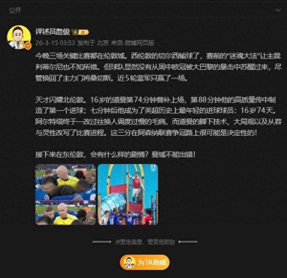 03月15日訊 本輪英超,阿森納2-0戰勝埃弗頓,切爾西0-1不敵紐卡斯爾聯,著名評述員詹俊先生在社媒發表點評。