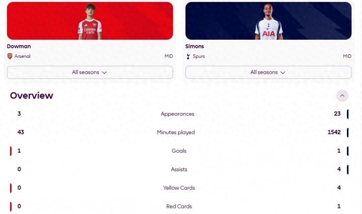 道曼本賽季只用了43分鐘便打進英超首球,熱刺新援哈維·西蒙斯也只有一個英超進球,但他已踢了23場出戰1542分鐘。