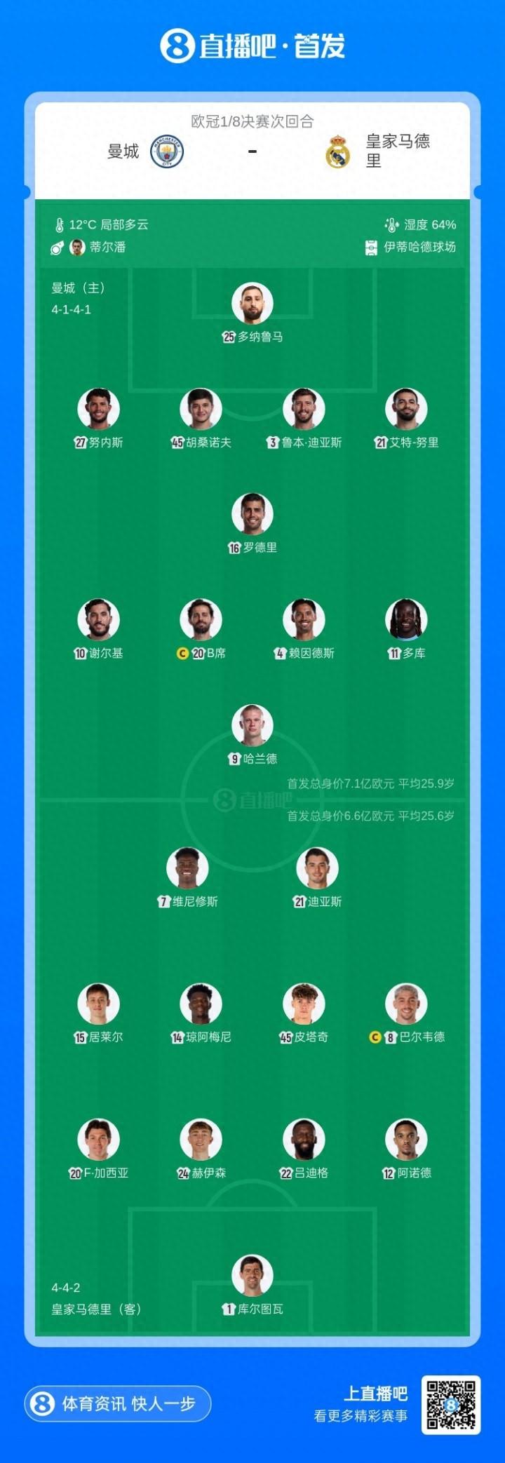 03月18日訊 歐冠1/8決賽次回合,曼城對陣皇馬,兩隊首發公佈。