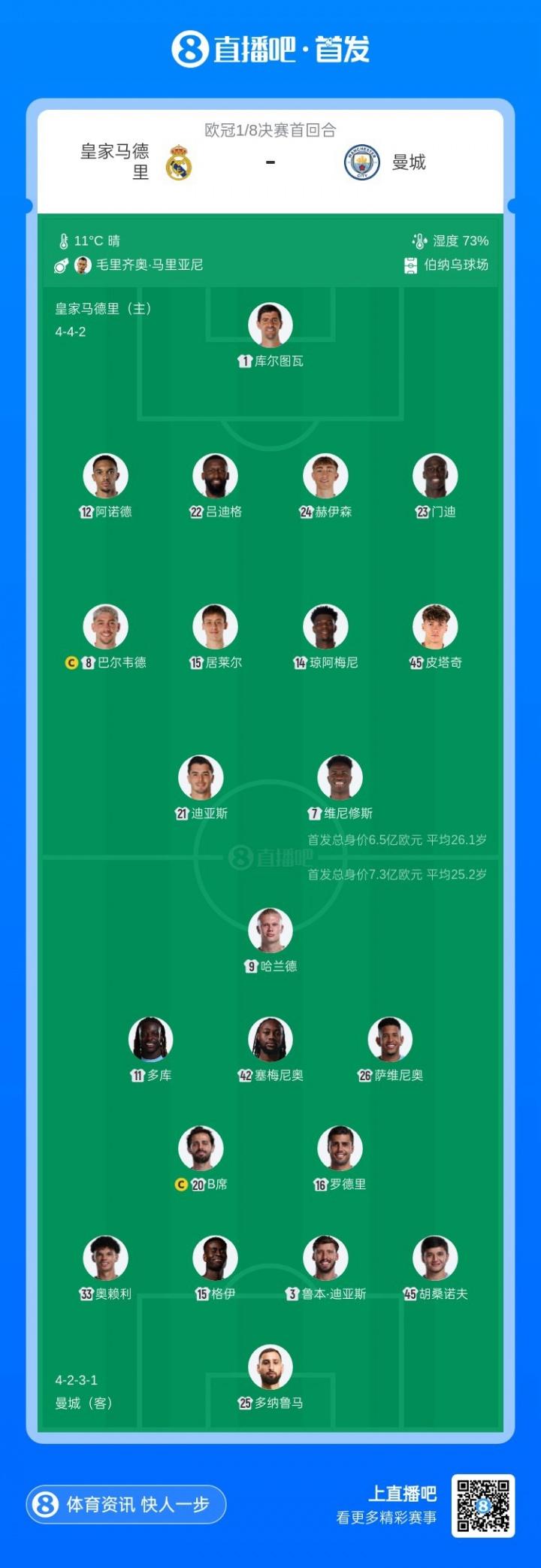 和首回合相比,曼城首發做出4處調整,努內斯、努裏、賴因德斯、謝爾基先發,格伊、奧賴利、薩維尼奧和塞梅尼奧替補。皇馬只有一處調整,弗蘭·加西亞頂替受傷的門迪。