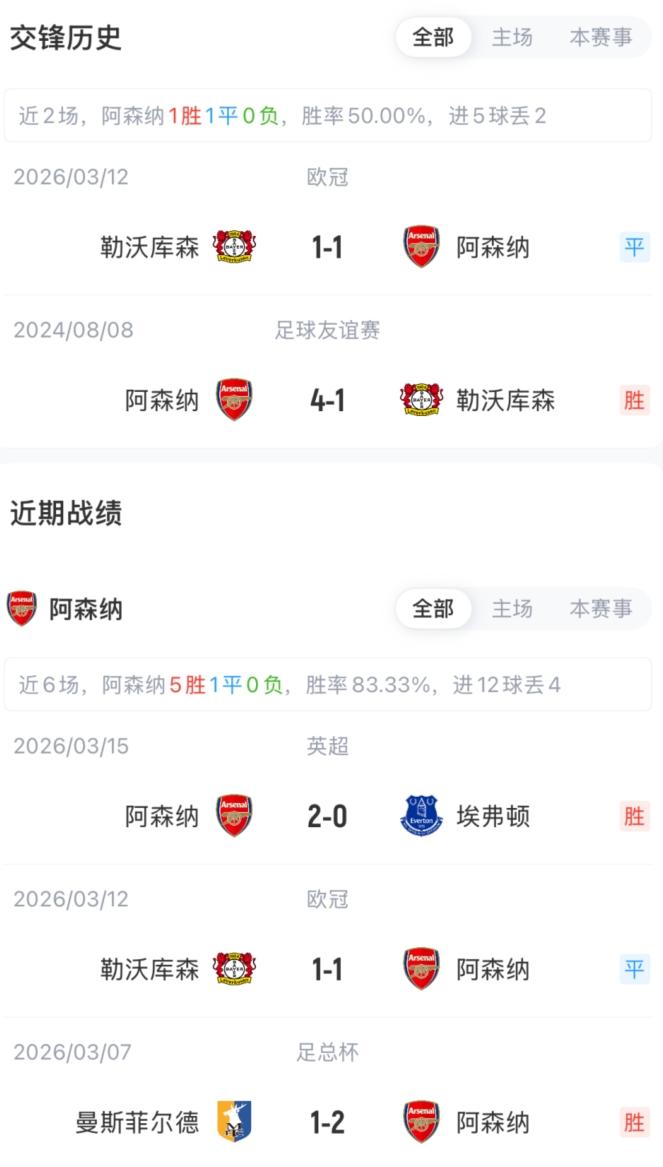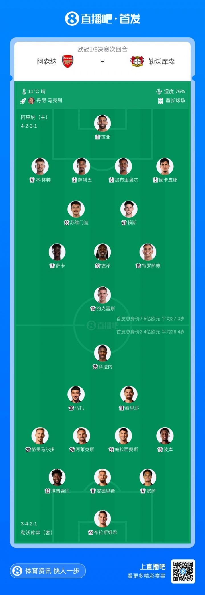 3月18日訊 歐冠16強次回合,阿森納主場迎戰勒沃庫森比賽即將打響。賽前首發出爐。首回合對陣,勒沃庫森1-1戰平阿森納。