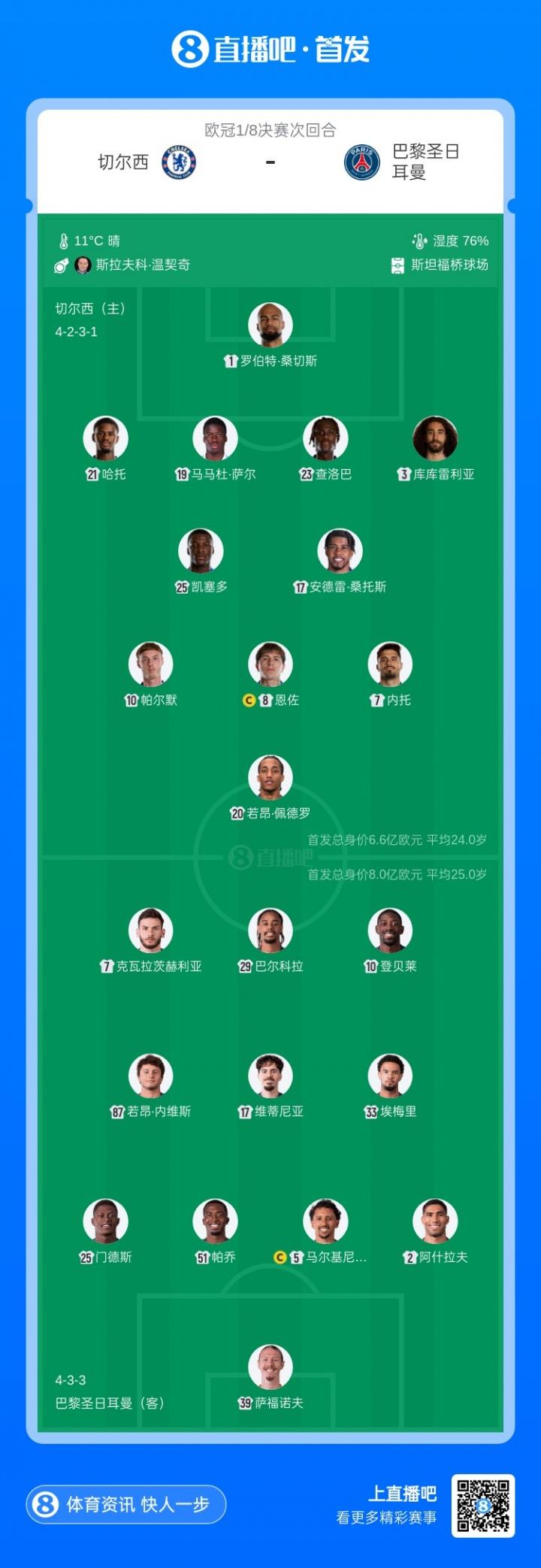 切爾西首發:1-桑切斯、3-庫庫雷利亞、19-薩爾、21-哈託、23-查洛巴、25-凱塞多、8-恩佐、17-安德雷·桑托斯、7-內託、10-帕爾默、20-若昂·佩德羅