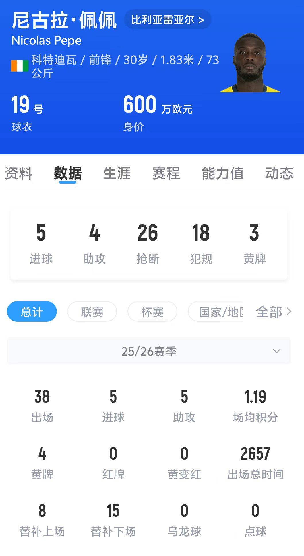 尼古拉·佩佩現年30歲,本賽季代表比利亞雷亞爾出場38次,貢獻5球5助攻,當前身價600萬歐。