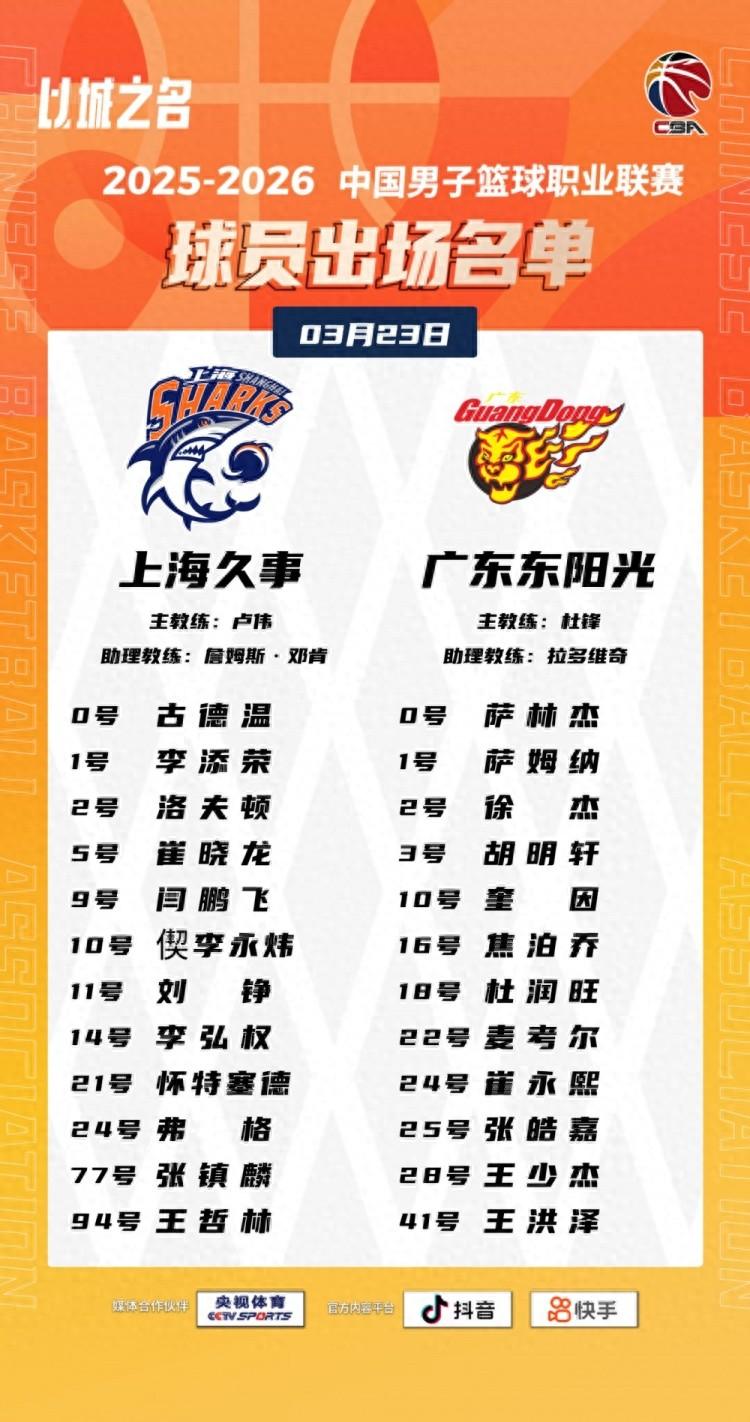 3月23日訊 今晚19:35CBA常規賽,上海主場迎戰廣東,賽前雙方公佈了本場大名單。