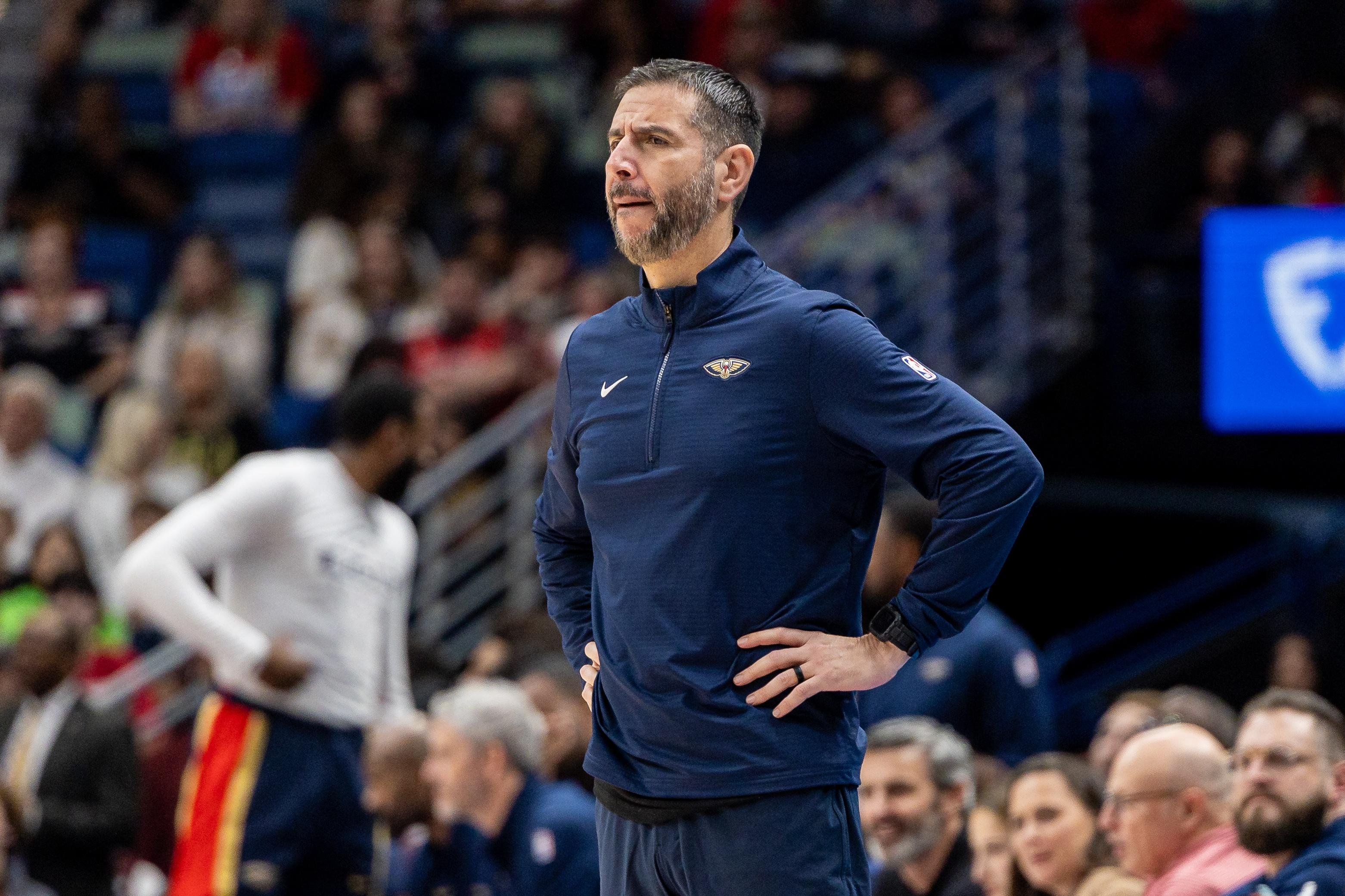 鵜鶘主教練詹姆斯·博雷戈示意兩名防守球員上前包夾哈登,試圖迫使他傳球。