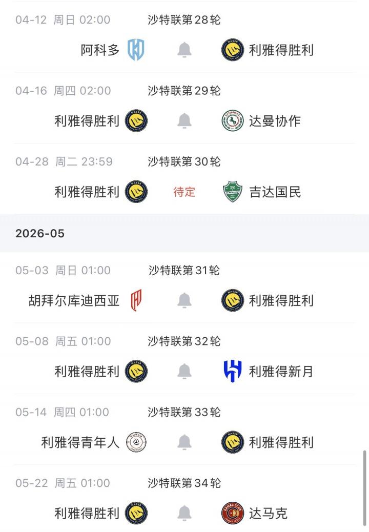 利雅得勝利還剩7場聯賽,第32輪將主場迎戰新月,C羅有望收穫自己的首個沙特聯冠軍。