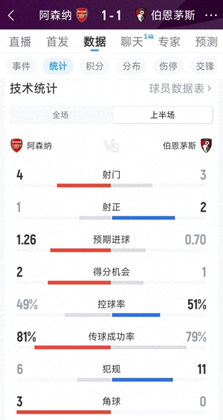 4月11日訊 本輪英超阿森納對陣伯恩茅斯上半場戰罷,雙方暫時1-1戰平,以下爲雙方半場數據對比: