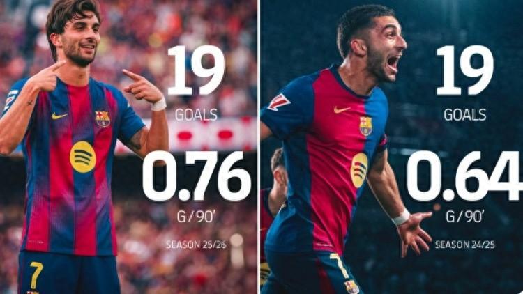 巴薩官方也曬出數據對比照,表示費蘭本賽季已打進19球,追平他個人上賽季的總進球數。與此同時,費蘭的每90分鐘進球數也從上賽季的0.64球升至本賽季的0.76球。