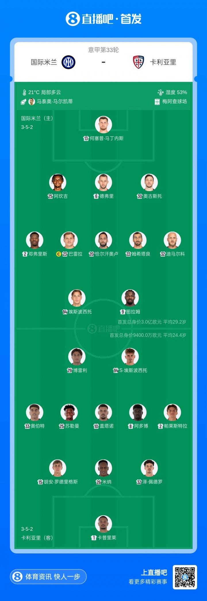 4月18日訊 意甲第33輪,國際米蘭主場迎戰卡利亞里,賽前雙方首發公佈。