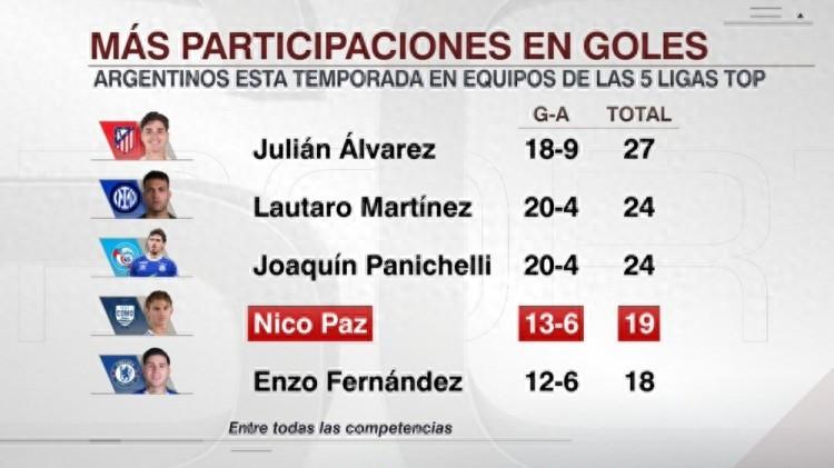 據ESPN統計,尼科·帕斯是本賽季參與進球第四多的五大聯賽阿根廷球員。