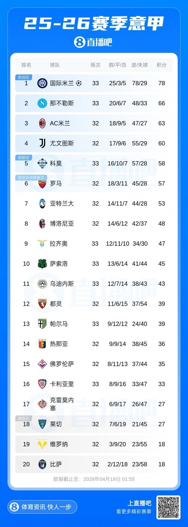 04月19日訊 本輪意甲,那不勒斯不敵拉齊奧,那不勒斯在剩餘5輪的情況下落後榜首國米12分。