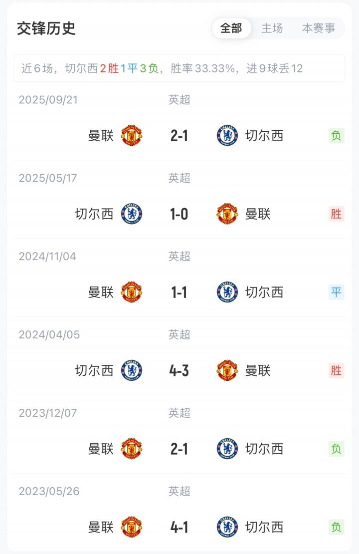 切爾西聯賽13勝9平10負積48分暫位英超第6,距歐冠區4分,聯賽近7輪僅1勝;曼聯聯賽15勝10平7負積55分位居英超第3,目前已連續兩輪不勝。切爾西近4次對陣曼聯僅1負(2勝1平1負)。