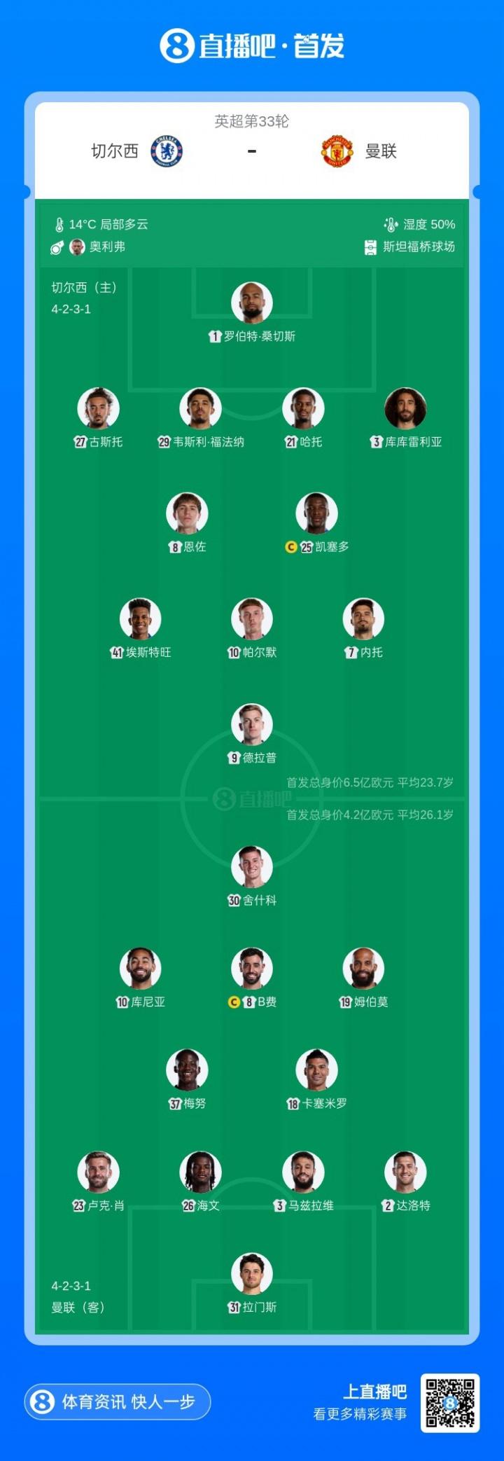 4月19日訊 英超第33輪,切爾西主場迎戰曼聯,賽前雙方首發公佈。切爾西方面,恩佐解除隊內禁賽迴歸,帕爾默、德拉普、內託先發出戰;曼聯方面,梅努、姆伯莫、達洛特先發,齊爾克澤、阿瑪德替補待命。