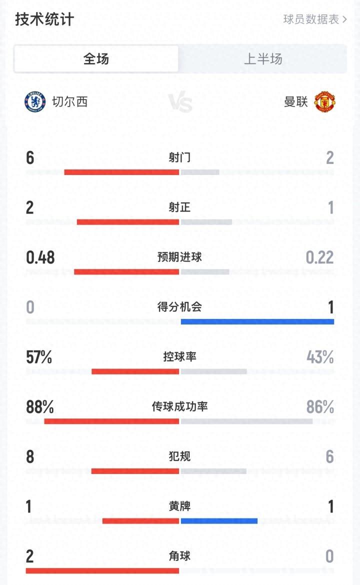 04月19日訊 英超第33輪,曼聯暫客場1-0領先切爾西,半場數據↓