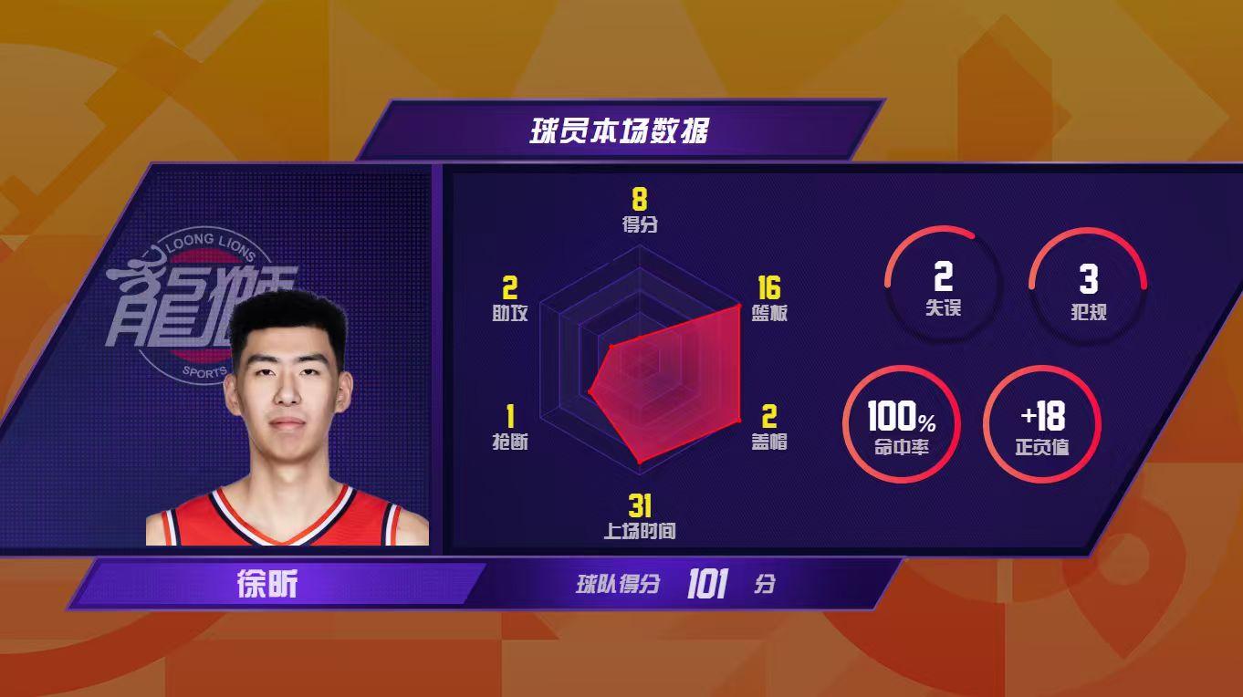 內線方面,廣州隊徐昕摘下16個籃板,本賽季第3次拿到15個以上的籃板,超過上海久事隊王哲林,成爲單場搶下15個以上籃板球最多的國內球員。本賽季聯賽只有劉傳興、周琦、鄒雨宸、楊曦皓、劉澤一、王哲林和徐昕這7位本土球員有過單場15個以上的籃板的表現。值得一提的是,徐昕是本賽季所有球員中,第一位以100%命中率+100%罰球命中率搶下15籃板的球員。在CBA聯賽歷史中,只有王徵、劉傳興2位本土球員曾達此成就。