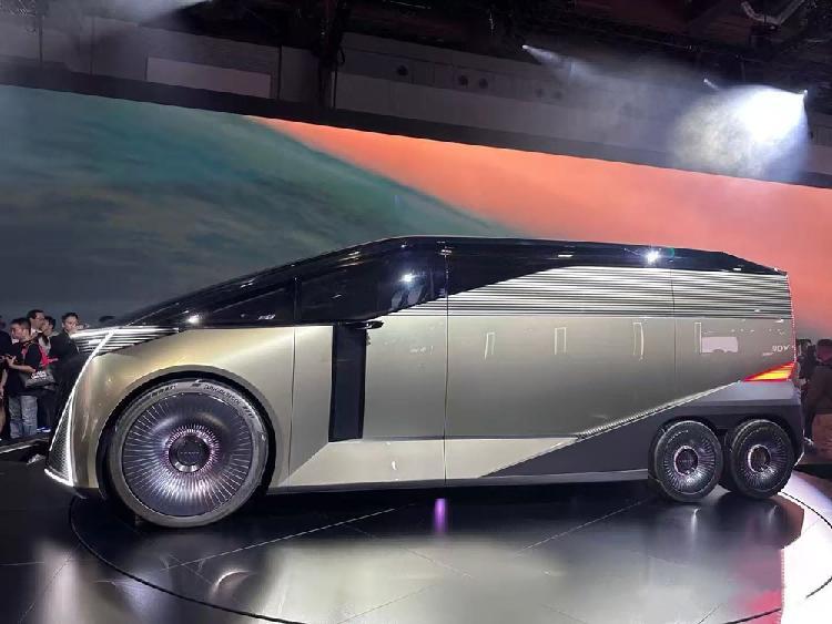 值得一提的是,新車設計了6個輪子,前2後4,總計三橋六輪佈局,要知道的是,這種結構通常只能在卡車上見到。更需要注意的是,這臺車的後輪明顯小於前輪,辨識度很高。