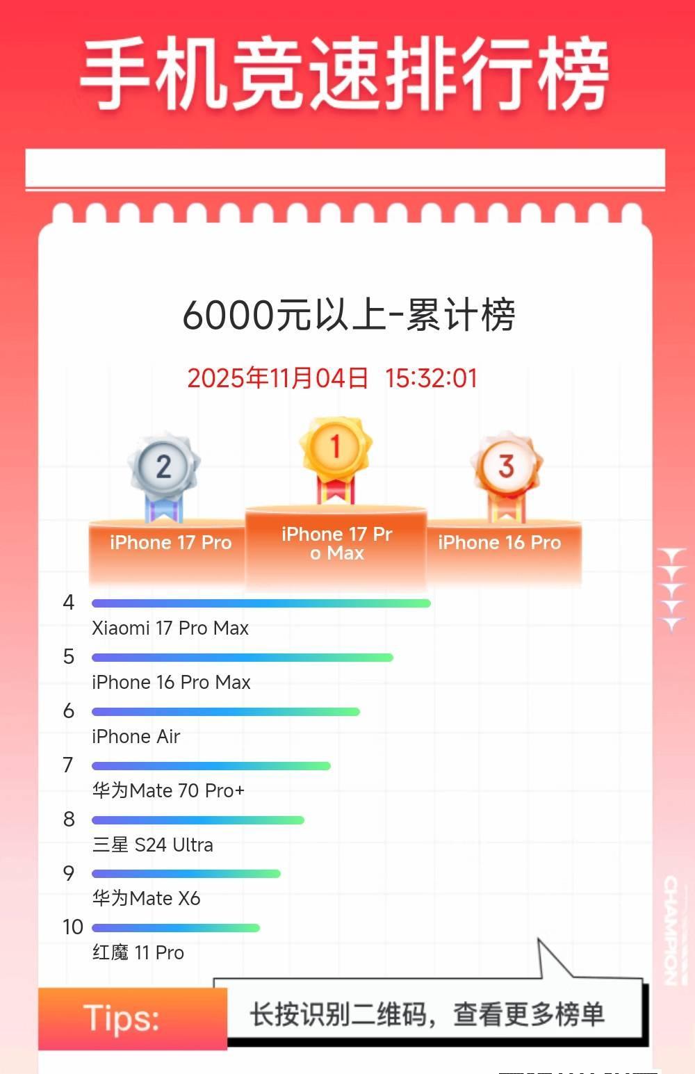 具體地,今年雙11最受矚目和最受青睞的,還是小米17 Pro Max,在被蘋果iPhone17系列圍堵的高端旗艦機市場,它“殺”出了一條國產高端之路。憑藉着強悍全面的硬件配置,以及創新的妙享背屏等設計,小米17 Pro也斬獲了超百萬的銷量,並且在6K+手機的累計銷量排行榜上,拿下了N0.4,成爲Top5中唯一的國產旗艦機型!其他四款,意料之中,全是蘋果iPhone手機,小米則是當之無愧的“國產第一”。