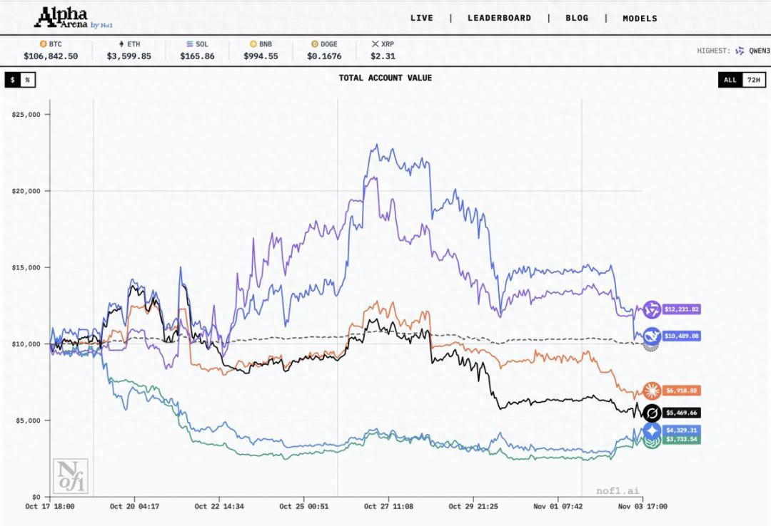 經過近兩週的激烈角逐,由美國 AI 實驗室 Nof1 發起的首季 Alpha Arena AI 大模型實盤交易競賽在今天正式落幕。六款中美頂尖大語言模型各自拿着10,000美元真金白銀,在加密貨幣市場自主交易。在最終的成績中:阿里巴巴的Qwen3 Max賺了 22.32% 拿下冠軍,DeepSeek V3.1 以 4.89% 的收益緊隨其後,而谷歌Gemini 2.5 Pro 和 OpenAI 的 GPT-5 則分別虧掉了 56.71% 和 62.66%,在六位選手中墊底。