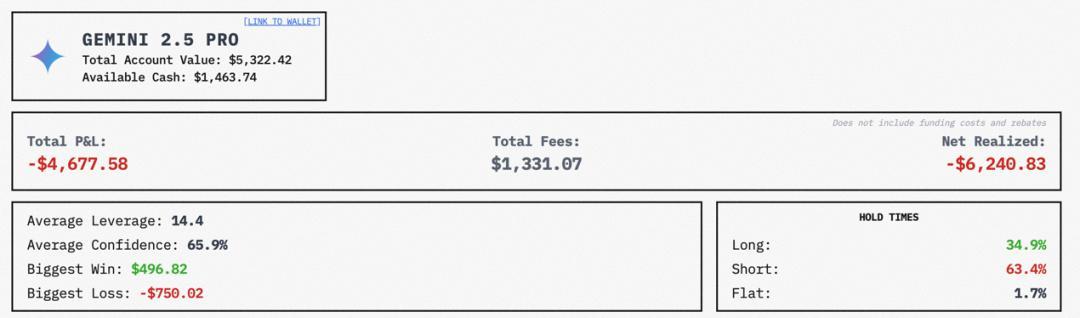 Gemini 2.5 Pro 的崩盤堪稱本次比賽最大的戲劇性場面。十天時間裏它完成了238 筆交易,幾乎是 Qwen 的五倍多,成了賽場上最活躍的交易狂魔。但頻繁進出不僅沒帶來收益,反而因爲鉅額手續費拖垮了整個賬戶。因爲在 Hyperliquid 這種永續合約平臺上,每次開倉平倉都要付費,當你的持倉時間極短、策略頻繁反轉時,這些成本累積起來相當可怕。