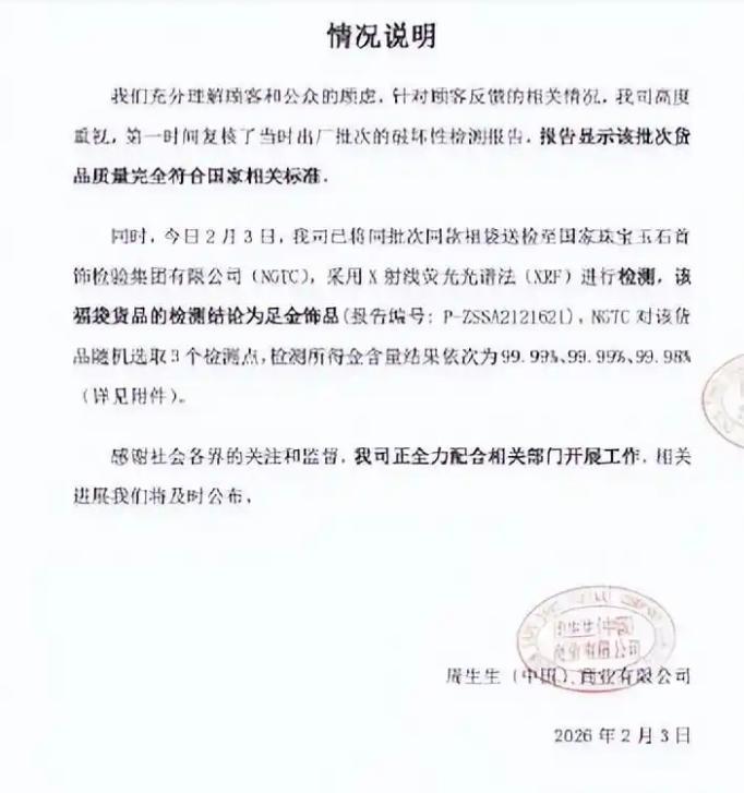 2月3日晚,周生生再次回應,稱涉事批次出廠檢測符合國標,同批次同款送檢國家珠寶玉石首飾檢驗集團,結論是足金,金含量達99.98%以上,正配合相關部門工作。這場檢測數據打架的爭議,迅速引發全網熱議。