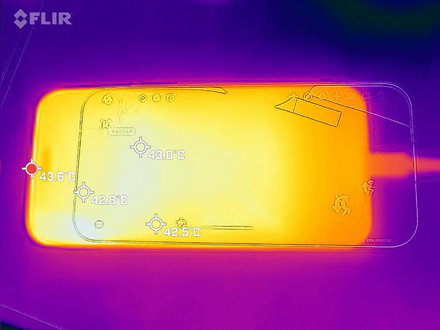 在《原神》跑圖測試結束之時,我們還採用了紅外測溫儀測試了手機表面溫度,測試時環境溫度約爲23℃,nova 15 Pro的最高溫度出現在前置攝像頭邊上,爲43.6℃,較熱的區域也有43℃左右;背面最高溫度爲44.6℃,出現紅楓原色鏡頭的邊上。綜合遊戲幀率與發熱來說,nova 15 Pro的遊戲性能表現還是讓人滿意的。