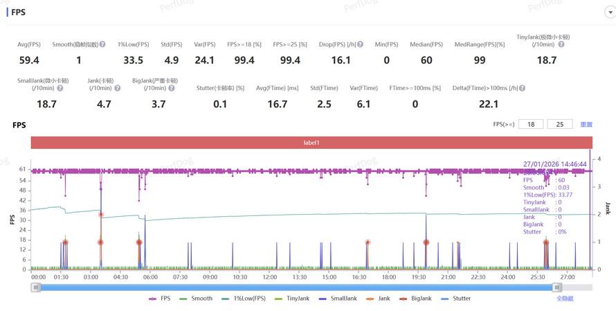 我們使用了《原神》測試了nova 15 Pro的遊戲性能,測試時畫質設置爲高,開啓60FPS高幀率模式,進行30分鐘跑圖測試,用性能狗有線測試模式記錄手機實際幀率(關閉充電),實測平均幀率爲59.4FPS,1%低幀率爲33.5FPS。