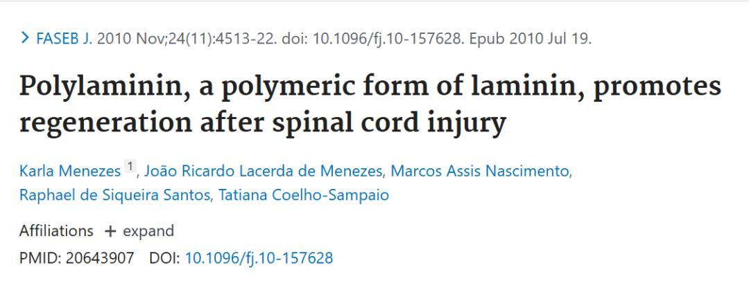 2010 年,團隊在 FASEB Journal 發表了關鍵論文:“Polylaminin, a polymeric form of laminin, promotes regeneration after spinal cord injury”。大鼠脊髓損傷模型顯示,聚層粘連蛋白能顯著促進再生。這是從基礎研究轉向應用轉化的起點。