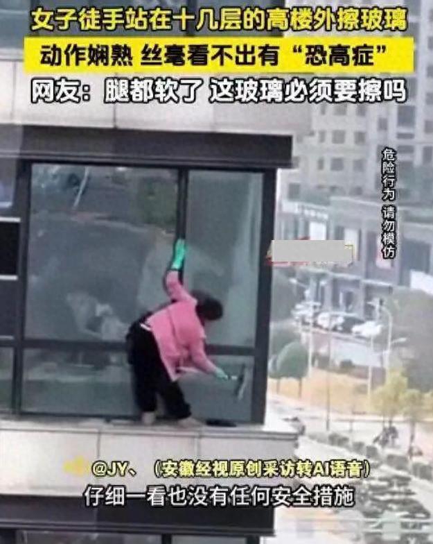近日,浙江一女子徒手站在十幾層高樓外擦玻璃的視頻,在網上引發熱議。視頻中,該女子身處十幾層高空,身旁沒有任何安全防護措施,僅憑雙手抓附窗邊,動作卻十分嫺熟,擦拭玻璃時有條不紊,絲毫看不出有恐高的跡象。