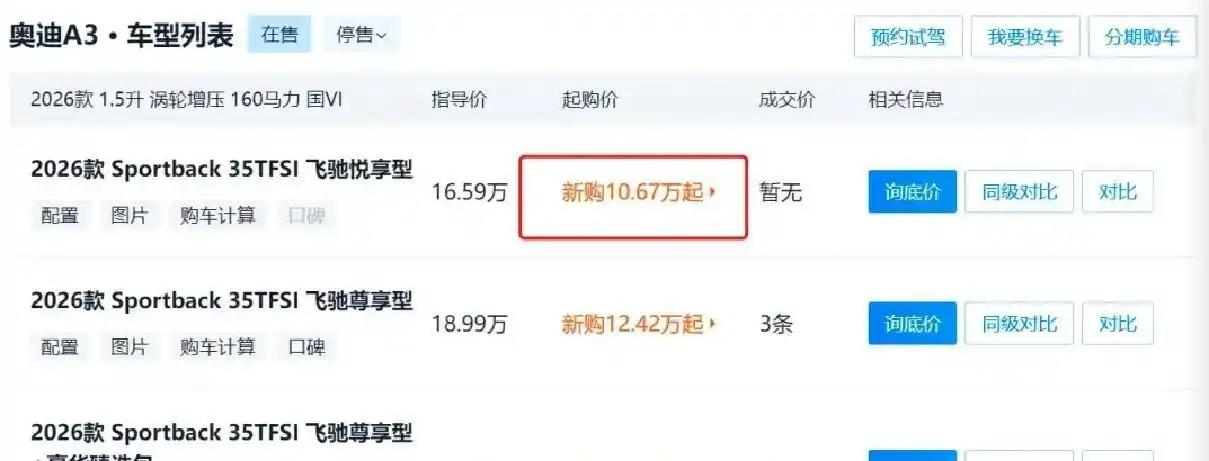 其次是產品換代清庫存,目前在售的奧迪A3距離上一次大改款已三年,經銷商庫存深度超標,必須降價騰挪產能。此外,奧迪還調整了中國市場策略,靠A3降價以價換量,吸引年輕消費者,爲後續置換高端車型培養潛在客戶,再加上廠家補貼與經銷商讓利疊加,最終形成大幅優惠。
