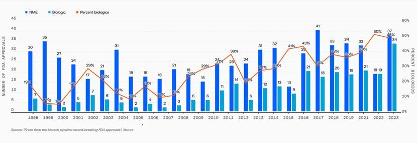 在更廣泛的生物技術領域,報告追蹤了從傳統小分子藥物向生物製劑(bilogics,通過生物過程衍生的藥物,如抗體療法)的轉型。2024 年新分子實體中,生物製劑的佔比已接近 50%。近半數藥物開發商將生物製劑列爲前三大創新優先事項。生物製劑的 FDA 審批時間線通常比小分子快,但開發成本更高、複雜度更大。