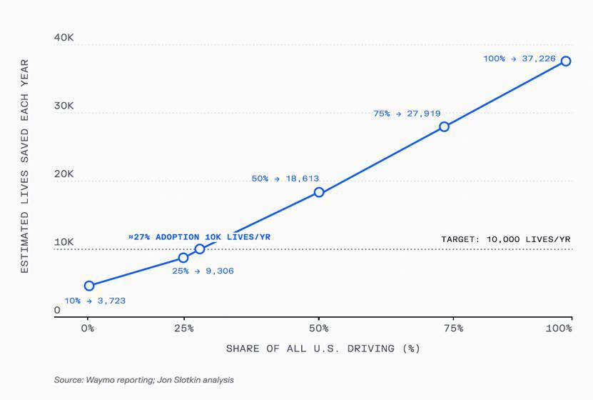 報告列出了一個相當吸引人的數據:如果全部美國車輛都達到 Waymo 的安全水平運行,每年可避免約 37,000 人死亡,節省約 1 萬億美元的社會成本。自動駕駛出租車的每英里成本也已經低於人類駕駛的出租車或網約車。其對於城市空間的影響更是重大,美國百萬人口以上城市平均將 22% 以上的土地用於停車,AV(Autonomous Vehicle,自動駕駛汽車)有望通過優化停車效率將停車空間需求降低 80%。