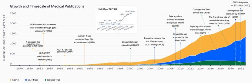 GLP-1 受體激動劑(Glucagon-Like Peptide-1 Receptor Agonists,胰高血糖素樣肽-1 受體激動劑)被報告稱爲“21 世紀最成功的藥物之一”。18% 的美國成年人目前正在服用某種形式的 GLP-1 類藥物。全球品牌抗肥胖藥物市場從 2019 年的約 10 億美元飆升至 2024 年的超過 150 億美元,預計將持續以超過 10% 的年增長率擴張。