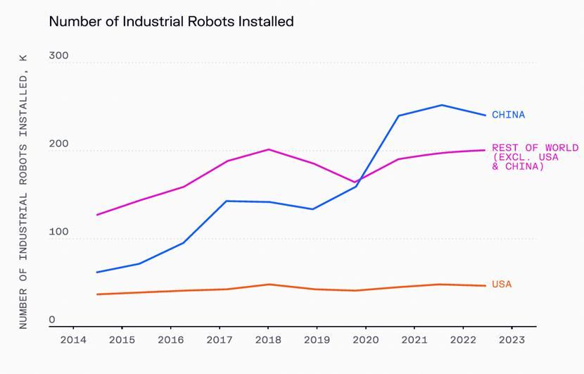 製造業和迴流(reshoring)是另一條重要線索。報告追溯了美國去工業化的歷史:NAFTA 生效和中國加入 WTO 是兩個關鍵轉折點,自此後美國製造業就業從高峯持續下滑。但還有一個常被忽視的推手是工業機器人的大規模應用。數據顯示,美國年度機器人出貨量已從早年的幾千臺攀升至 2.1 萬臺。而這個增長曲線遠未觸及天花板。中國在 2020 年工業機器人安裝量已超過全球其他國家的總和,而美國 90% 的工廠仍然沒有使用機器人。