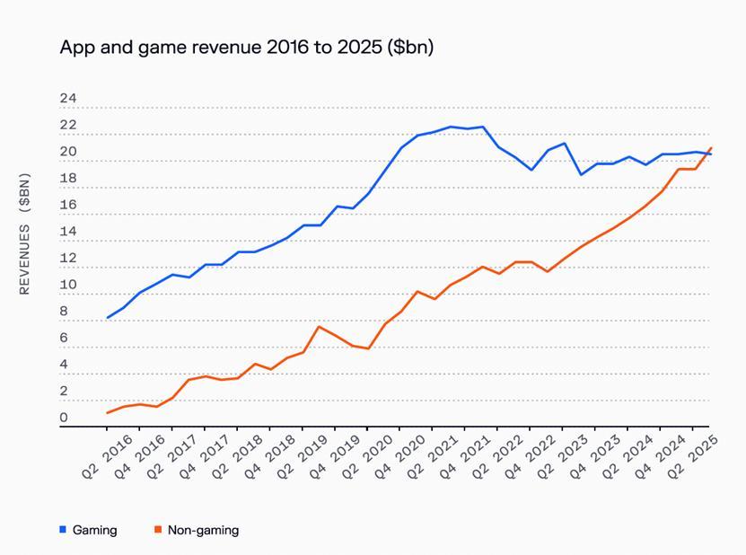 訂閱經濟在 2025 年經歷了一次有趣的結構性轉變。音樂和視頻內容仍然是最受歡迎的訂閱類別,Spotify 擁有 3.65 億訂閱者,Netflix 有 2 億訂閱者,兩者分別產生 39 億和 250 億美元的收入。但在移動應用領域,一個歷史性的轉折點出現了:長期以來,移動遊戲佔據移動應用收入的大頭,但在2025 年,這一格局被打破。AI 聊天機器人帶動非遊戲應用的收入首次超過了移動遊戲。