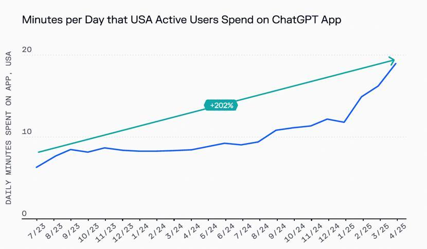最值得關注的變化是 LLM 聊天機器人的崛起。ChatGPT 美國活躍用戶的日均使用時長增長了 202%,消費者在這類工具上投入的時間越來越長。而在社交平臺方面,儘管 Facebook、YouTube 和 Instagram 在用戶數量上領先,但用戶在 TikTok 上花費的時間最多,顯示出短視頻內容對注意力的強大捕獲能力。