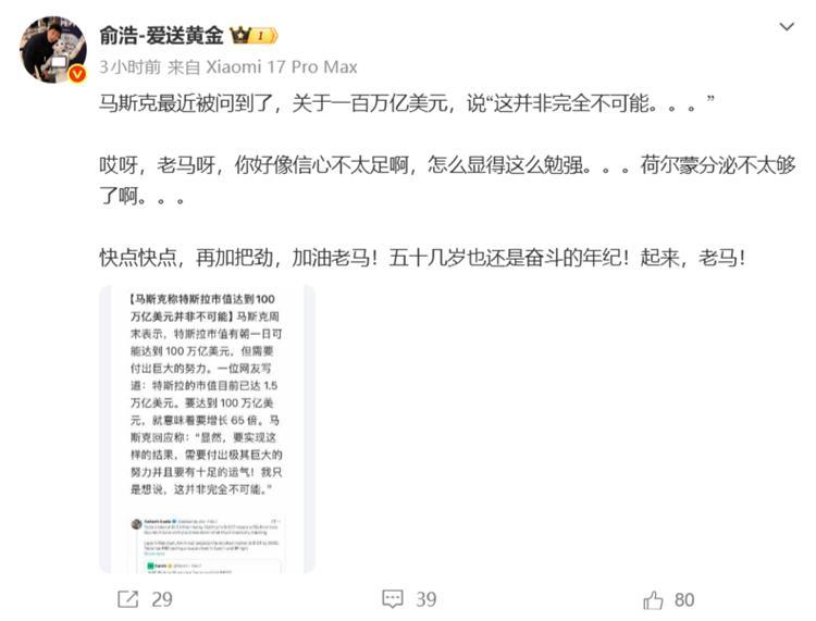 針對馬斯克的言辭,俞浩則表示馬斯克看起來信心不足,並且還鼓勵馬斯克“五十幾歲也還是奮鬥的年紀”。