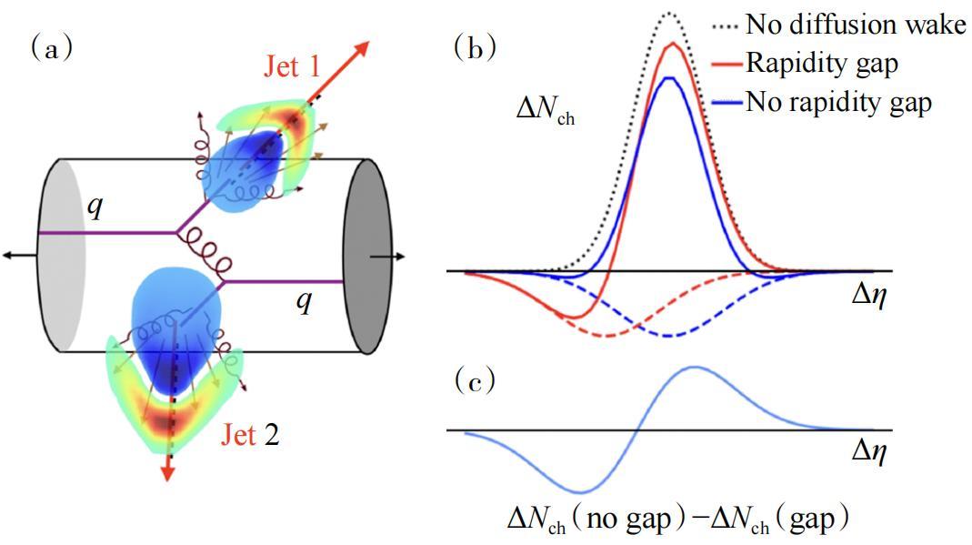 在噴注−強子關聯方面,華中師範大學研究團隊提出使用噴注−強子關聯的快度不對稱性作爲雙噴注中擴散尾跡的穩健且無背景的信號(圖8)。這種不對稱性出現是因爲一個噴注的擴散尾跡相對於另一個噴注移動到了有限的快度。未來這種快度不對稱性的測量可爲噴注誘導的擴散尾跡和QGP的性質提供更精確的物理依據。