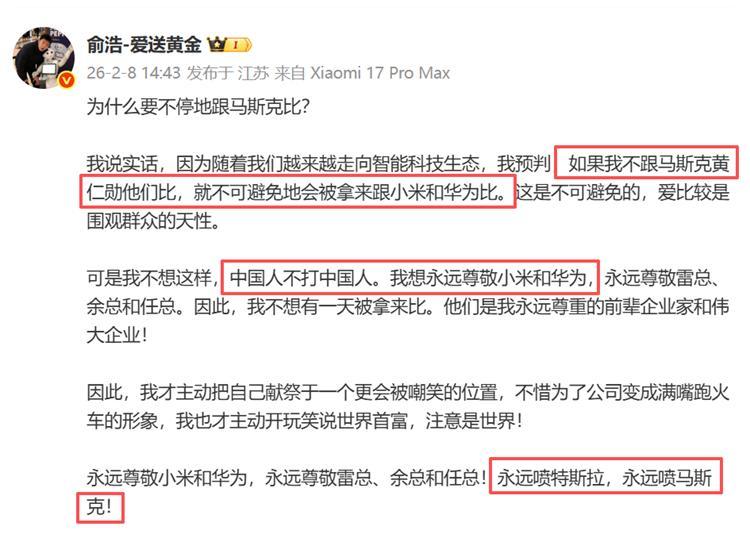 至於爲什麼俞浩總是要不停地和馬斯克比,自己也給出了說法!