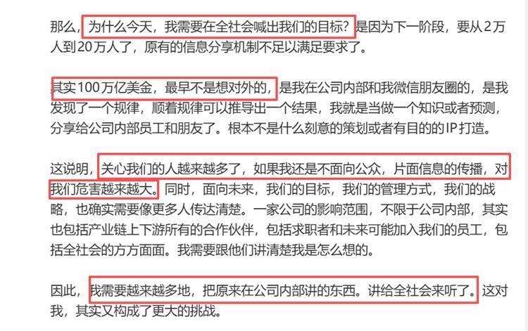 至於爲什麼要公開喊出目標,俞浩今天也是給出了自己的解釋,“其實100萬億美金最早是不想對外的,只是一個自己知識或預測,但隨着關心的人越來越多,如果還不面向公衆,片面信息的傳播,對公司的危害越來越大。”