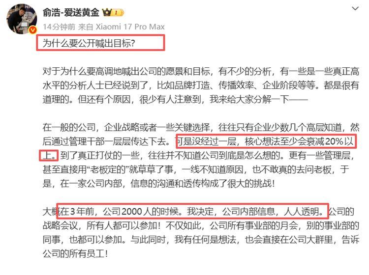 俞浩表示,“如果我不跟馬斯克、黃仁勳他們比,就不可避免地會被拿來跟小米和華爲比。可是我不想這樣,中國人不打中國人。”“我永遠尊敬小米和華爲,永遠尊敬雷總、餘總和任總,因此,纔將自己獻祭於一個更會被嘲笑的位置,不惜爲了公司變成滿嘴跑火車的形象,才主動開玩笑說世界首富”。