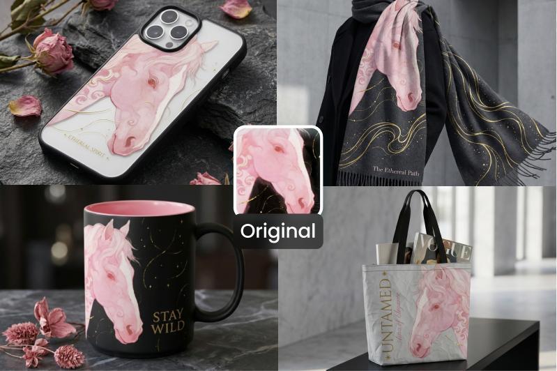 點擊生成後,幾十秒內系統便會輸出商品方案:同一張寵物照片,可以變成復古風的帆布包、賽博朋克風格的 T 恤、日系插畫感的抱枕。AI 還會根據圖片內容生成相契合的配文,避免傳統定製中常見的“文不配圖”問題。