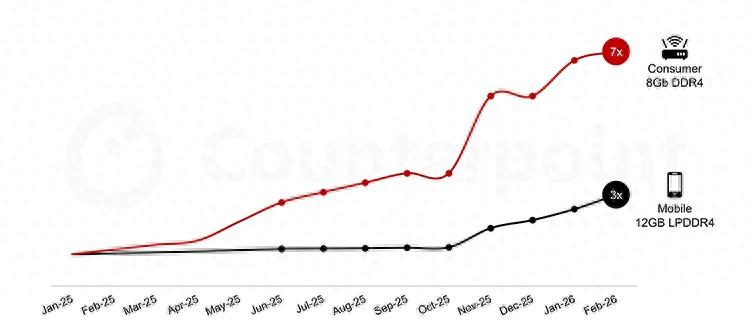 研究機構Counterpoint Research昨日的報道提到,在過去的一年中,內存價格漲幅超過了600%,並且上漲趨勢還會持續到今年6月份。雖然可能在6月達到峯值,但不代表價格就會下去,因爲供應緊張問題仍然存在。