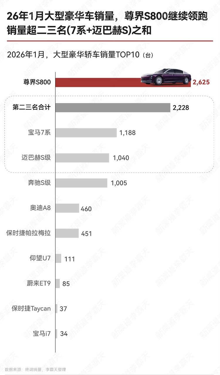而剛剛過去的2026年1月,傳統淡季中尊界S800銷量表現如何呢?近日知名博主“新渠道李霸天”發佈了1月份大型豪華車銷量表。尊界S800賣了2625臺,依舊穩坐第一。