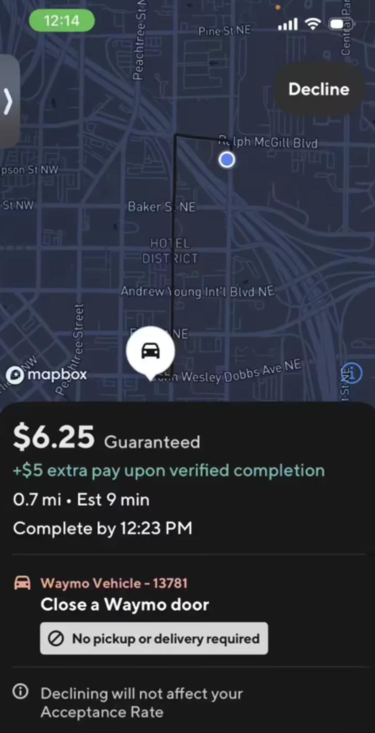 訂單佣金還不少呢,接單能獲得6.25美金,關上車門之後還能再給5美金,關個門11.25美金到手,這活我都想幹了。
